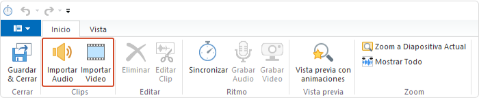 - Importar una o más narraciones de audio/video que se reproducirán en varias diapositivas.