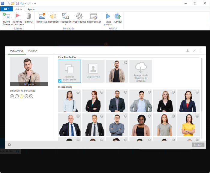 Al dar clic en el ícono de la fotografía, se abrirá una galería con una amplia selección de personajes predeterminados. Puedes elegir uno de ellos o incluso subir tus propios personajes para personalizar la simulación todavía más. Por ejemplo, uno de los personajes podría llevar el uniforme de uno de los miembros del área de ventas de tu empresa.